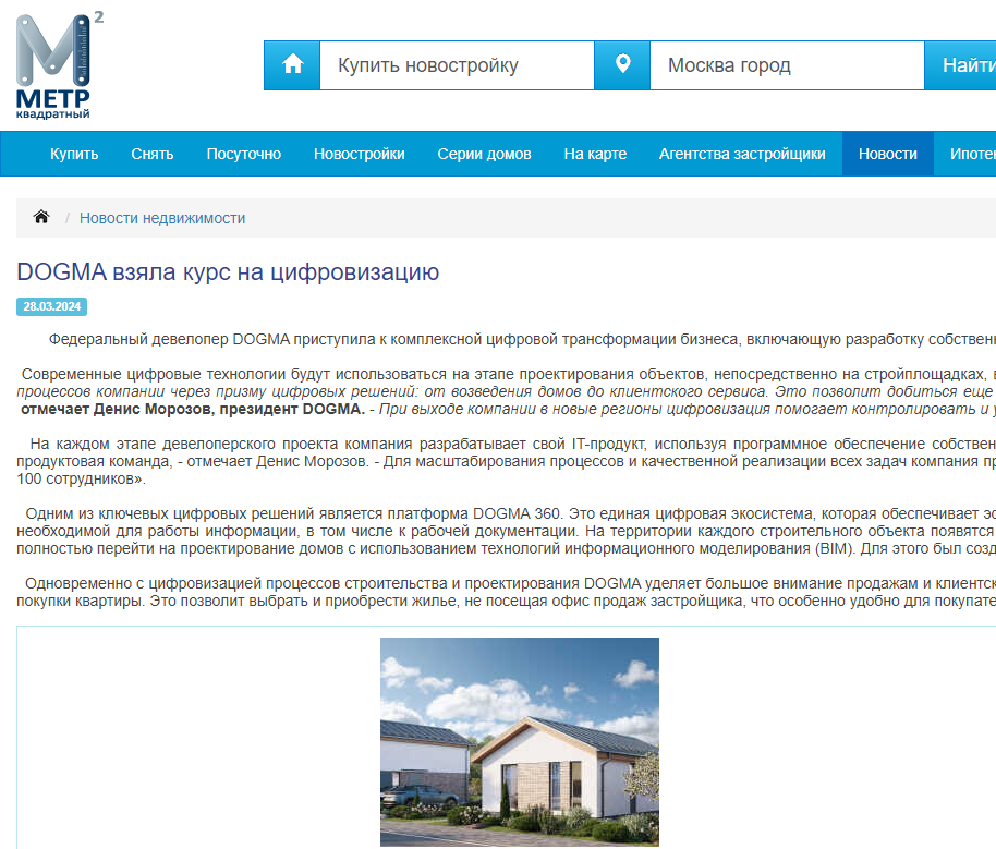 Одновременно с цифровизацией процессов строительства и проектирования DOGMA уделяет большое внимание продажам и клиентскому сервису. В скором времени девелопер запустит обновленный сайт, на котором появится функция онлайн-бронирования и впоследствии онлайн-покупки квартиры. Это позволит выбрать и приобрести жилье, не посещая офис продаж застройщика, что особенно удобно для покупателей из регионов.