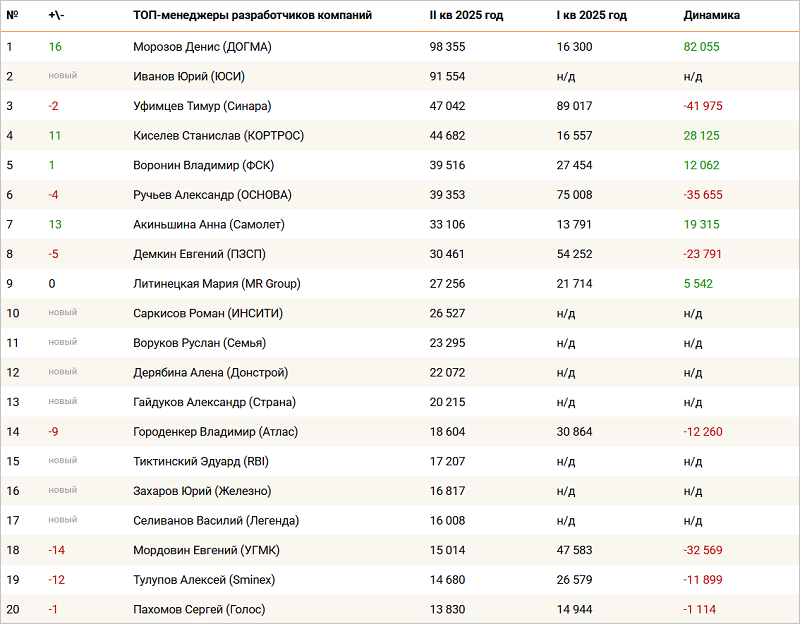 По итогам II квартала 2025 года лидером по индексу заметности стал президент строительной компании DOGMA Денис Морозов (индекс заметности — 98 355, +16 позиций).