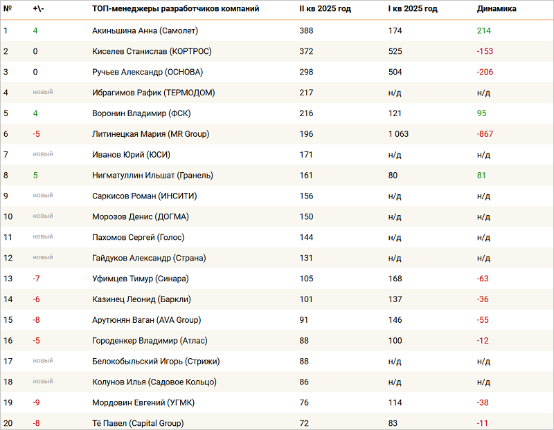 Четвертое место впервые занял генеральный директор СХ ТЕРМОДОМ Рафик Ибрагимов с 217 упоминаниями. На пятой строчке — Владимир Воронин (ГК ФСК) с 216 упоминаниями (+4 позиции).